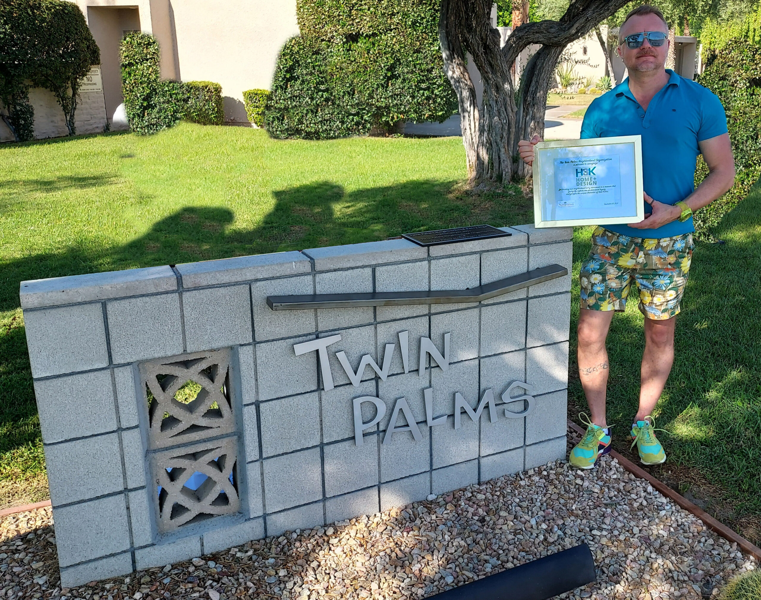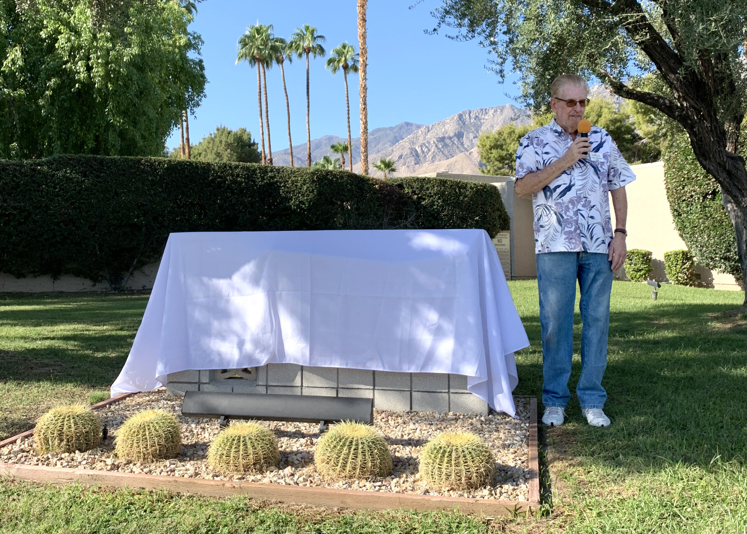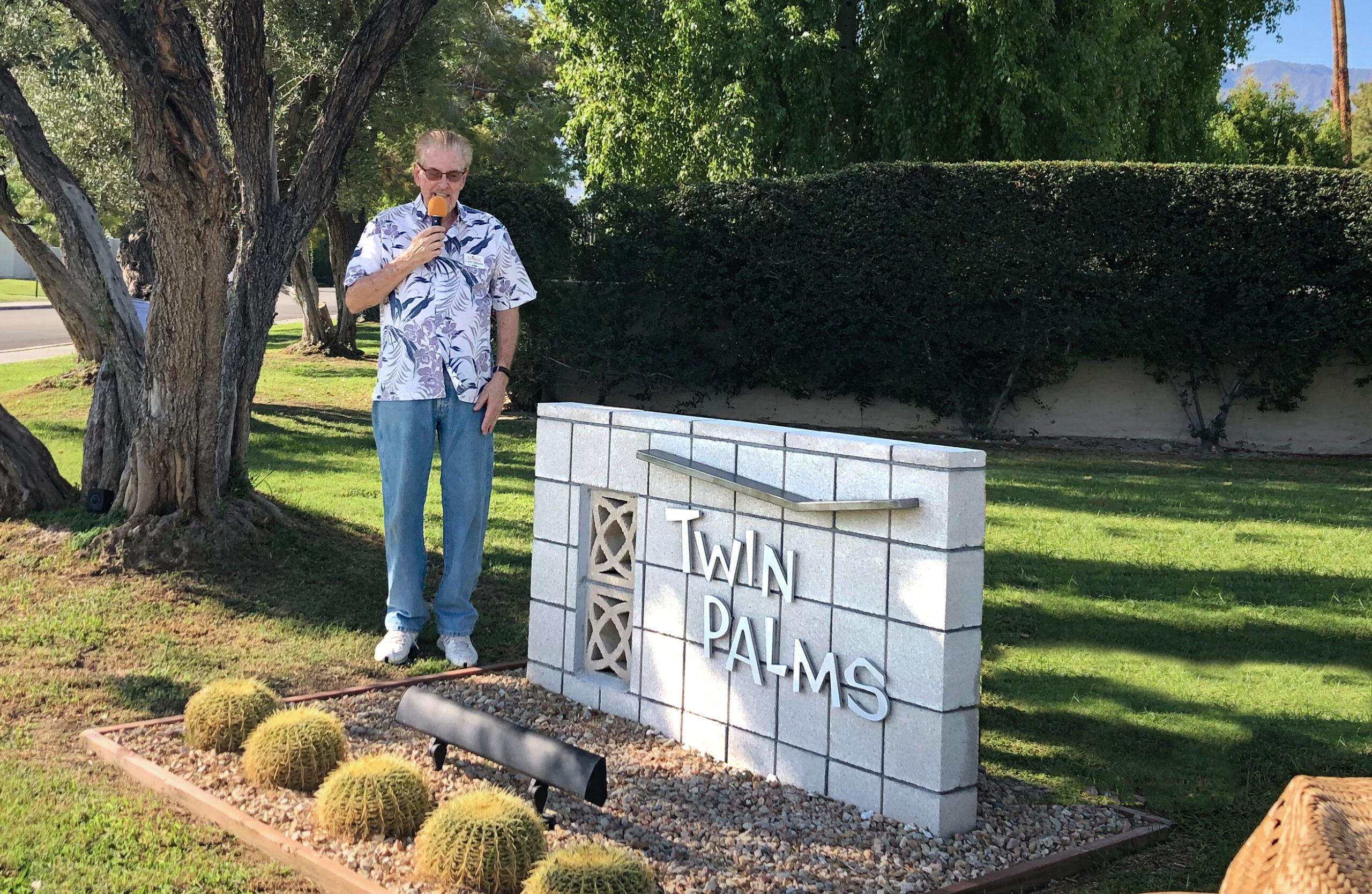 The Twin Palms HOA was recognized for their partnership in bringing the sign to life include their pivotal agreement to place the sign on their condominium grounds. John Lacombe, former member of the Twin Palms HOA, shared the HOA’s role in rerouting the irrigation system around the sign, connecting the lighting with their electrical grid, and installing the rock boarder and cactus landscaping.