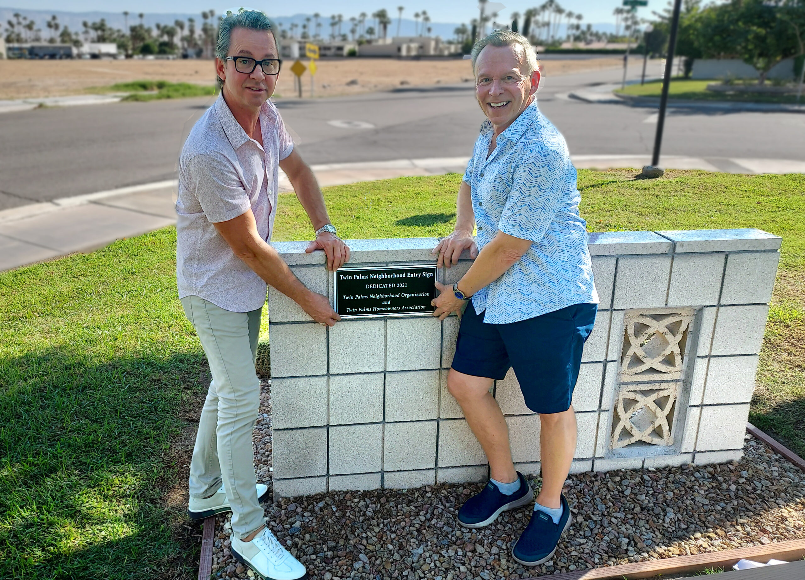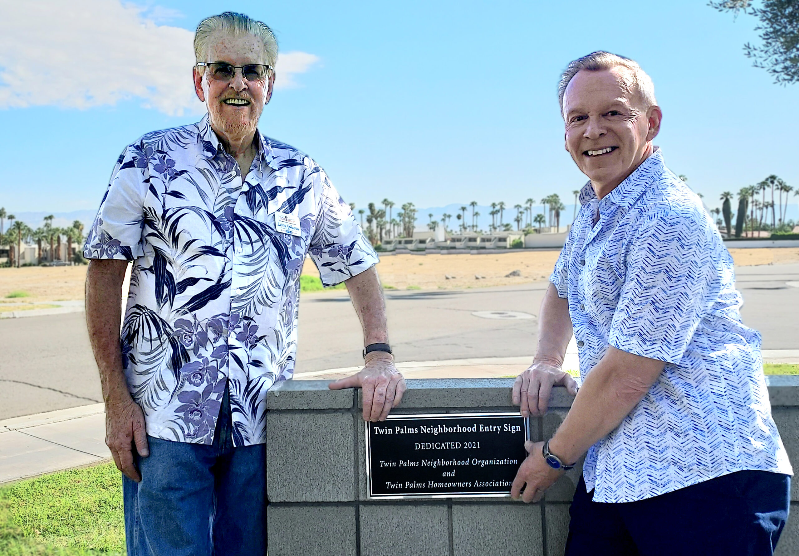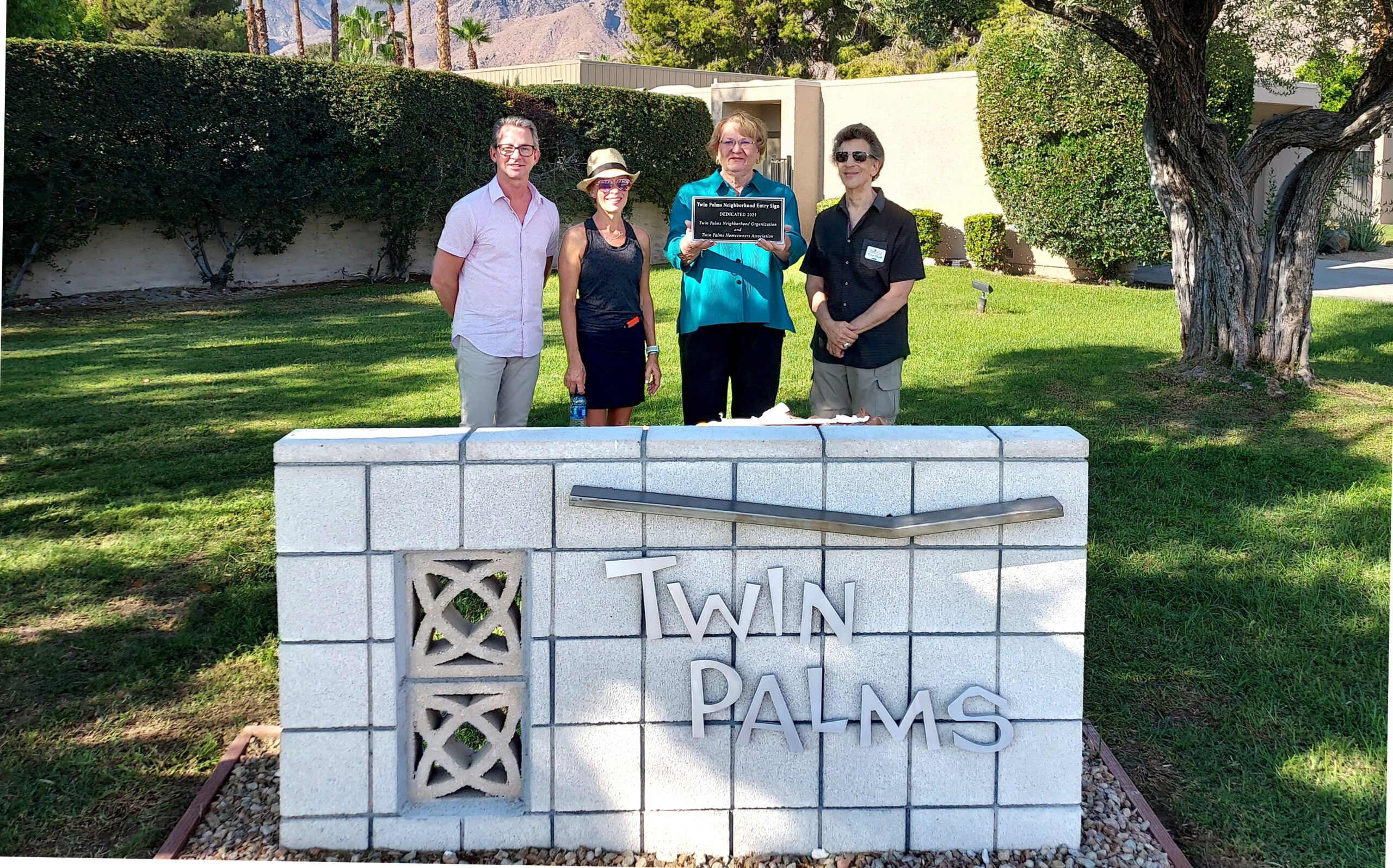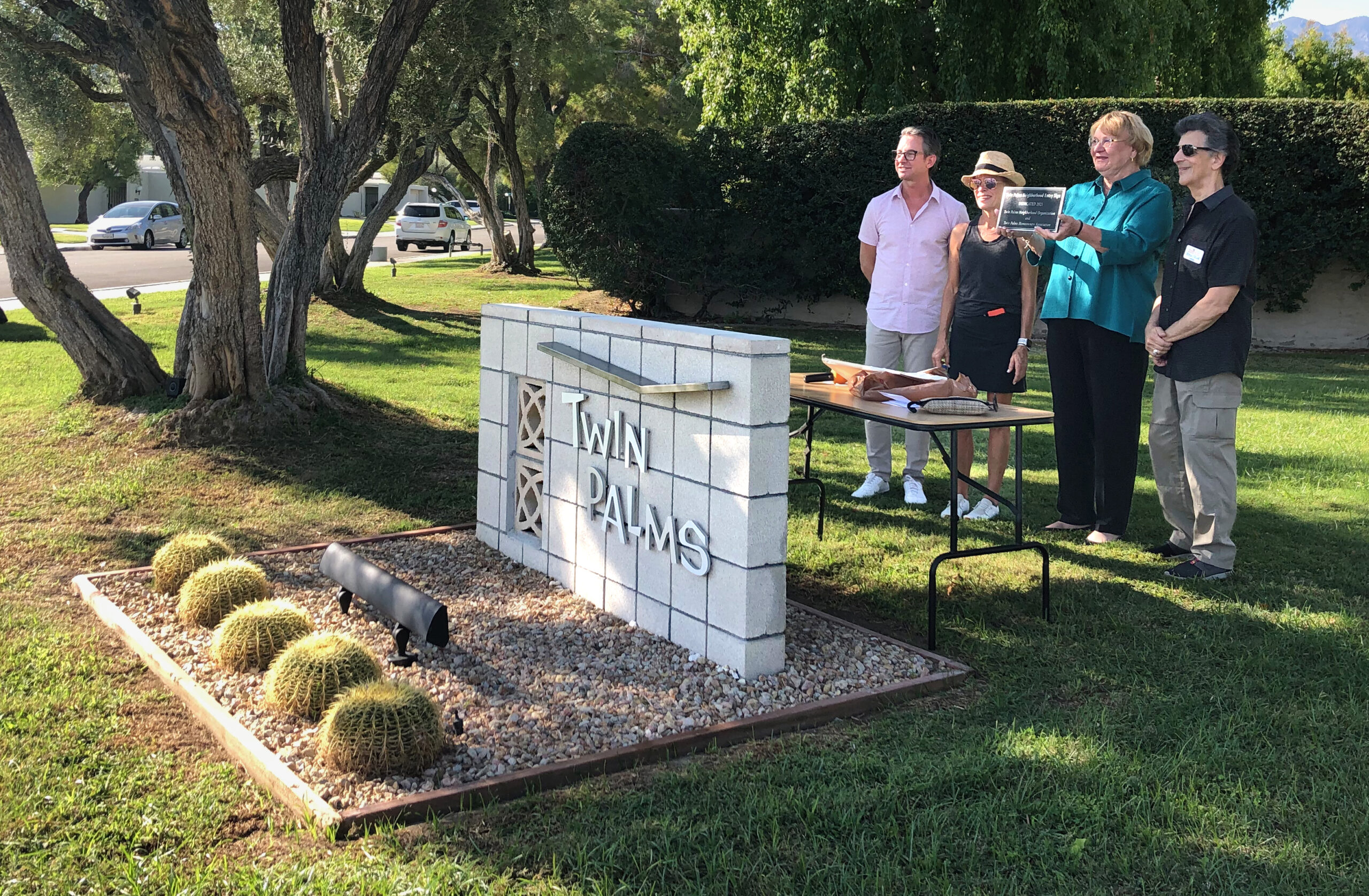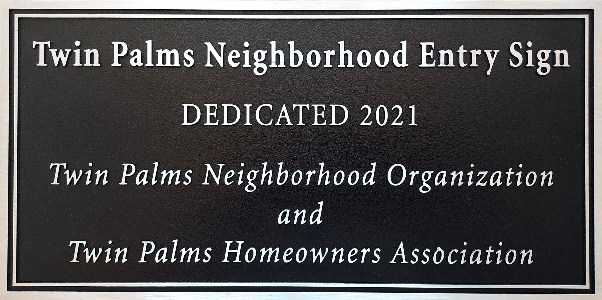 After over a year of postponements due to COVID, the formal dedication of the Twin Palms Neighborhood Entry sign was held on September 18, 2021 at 9:00 am. A plaque memorializing the roles of the Twin Palms Neighborhood Organization and the Twin Palms Homeowners Association in creating the monument sign was unveiled.