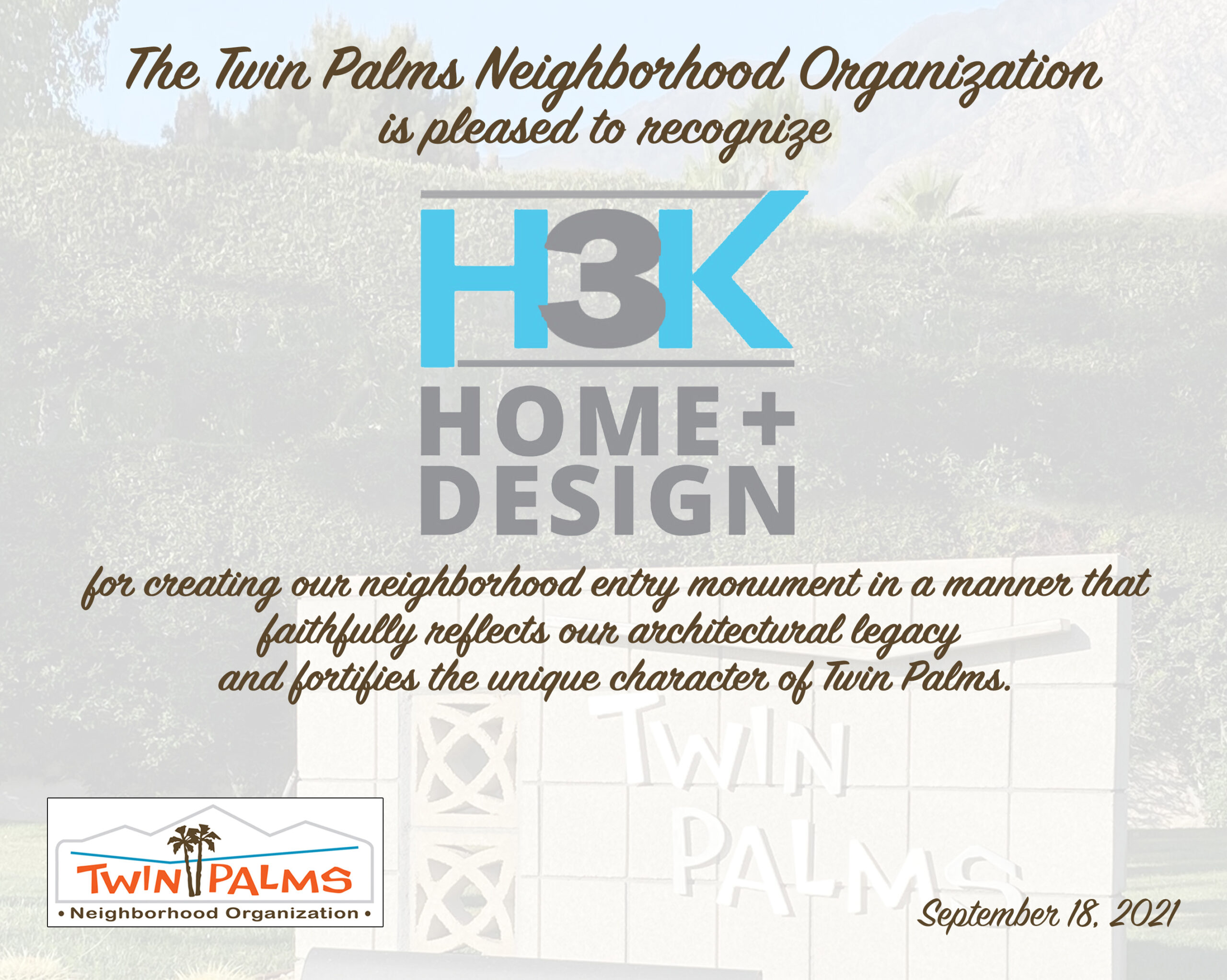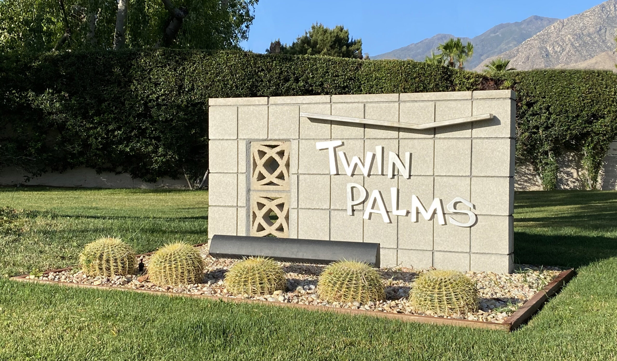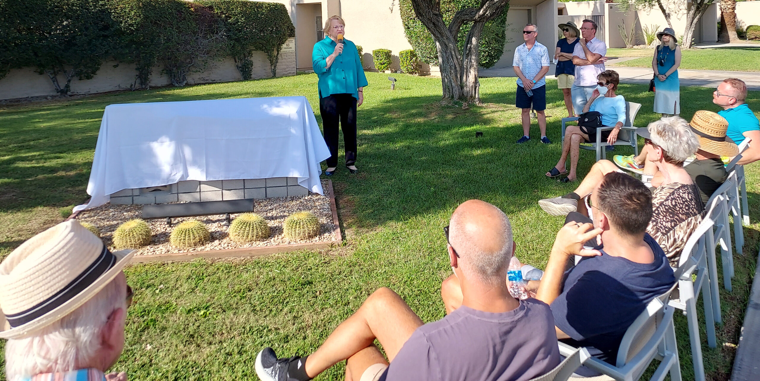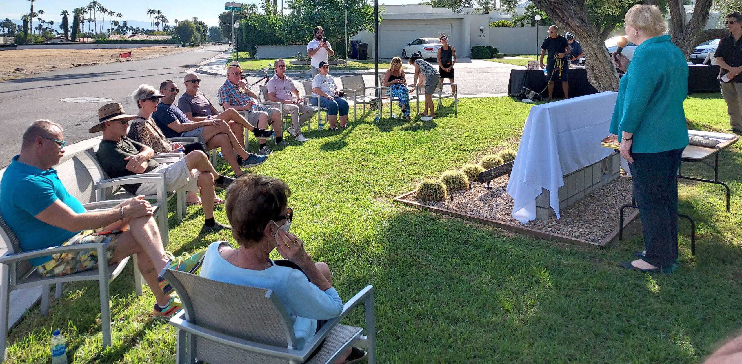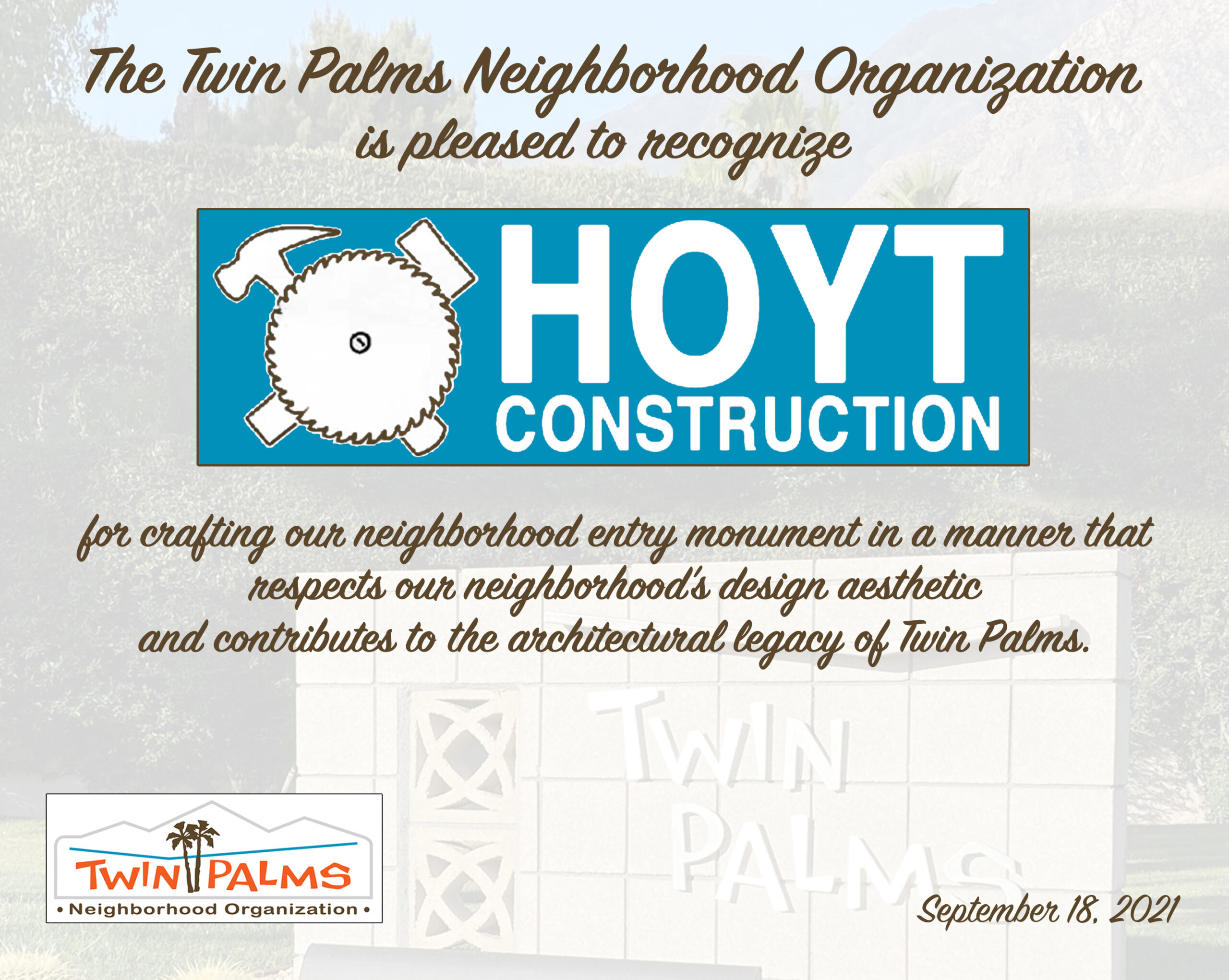 After over a year of postponements due to COVID, the formal dedication of the Twin Palms Neighborhood Entry sign was held on September 18, 2021 at 9:00 am. A plaque memorializing the roles of the Twin Palms Neighborhood Organization and the Twin Palms Homeowners Association in creating the monument sign was unveiled.