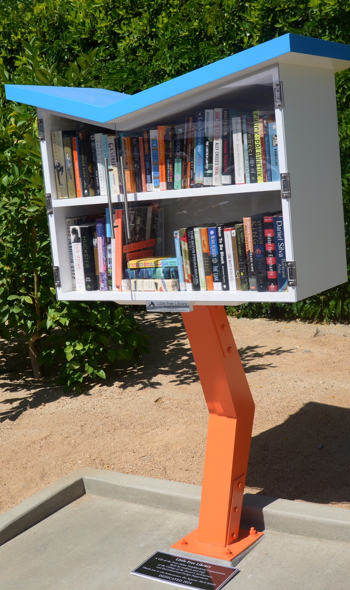 He said the Little Library’s design is inspired by the work of William Krisel, architect for many of the nearby homes in the neighborhood. It features a butterfly roofline and popular vibrant mid-century colors.