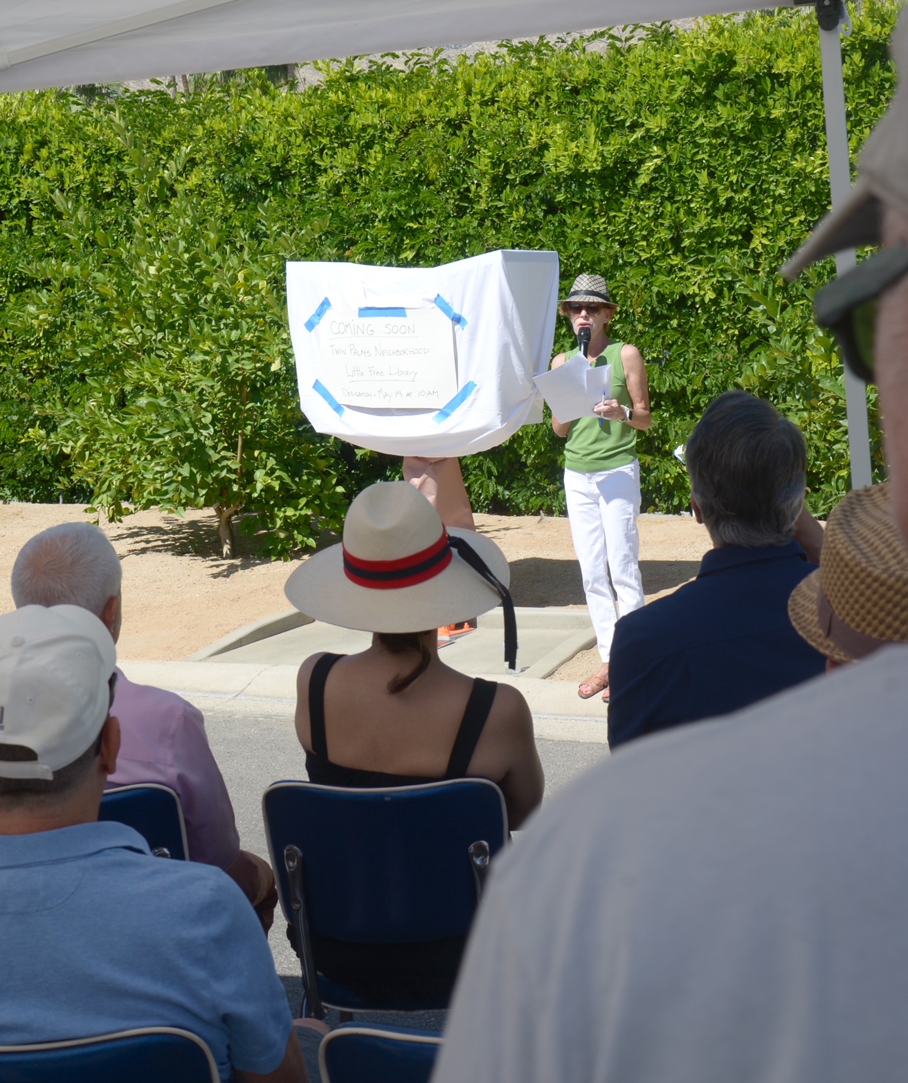 Carol Munro, TPNO Board chair, welcomed everyone to the unveiling and Dedication of the Twin Palms Little Free Library. She said over three years of planning went into its design, construction, and siting.