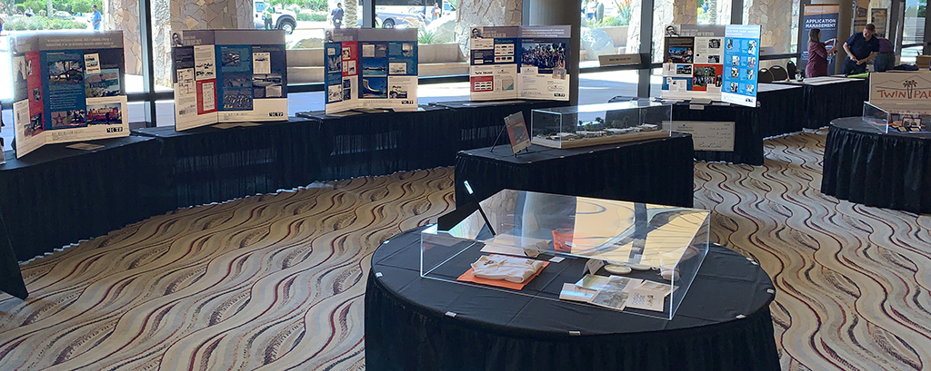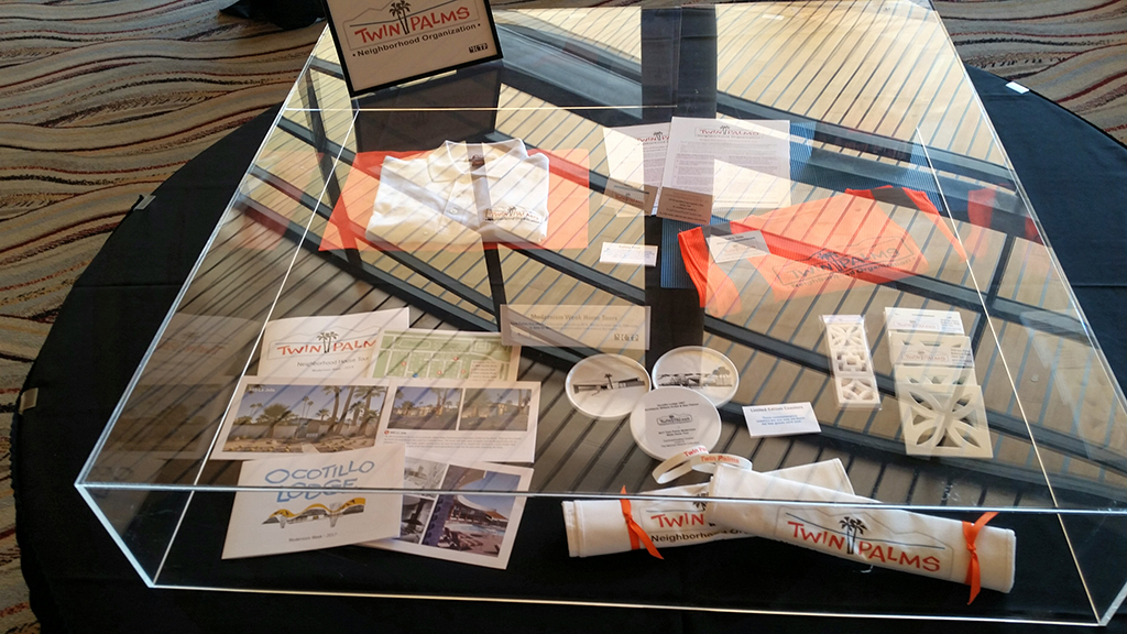 Held at the Palm Springs Convention Center, this was the most expansive showing to date of the exhibit providing conference delegates the opportunity to learn about our neighborhood and its founding architect. The largest display at the conference, the exhibit occupied five tables of descriptive panels and historical artifacts, two tables of Twin Palms memorabilia, one table displaying architectural scale-models of Twin Palms homes, one table of media notices about the neighborhood, and one table with information about the exhibit and recognition of its sponsors.
