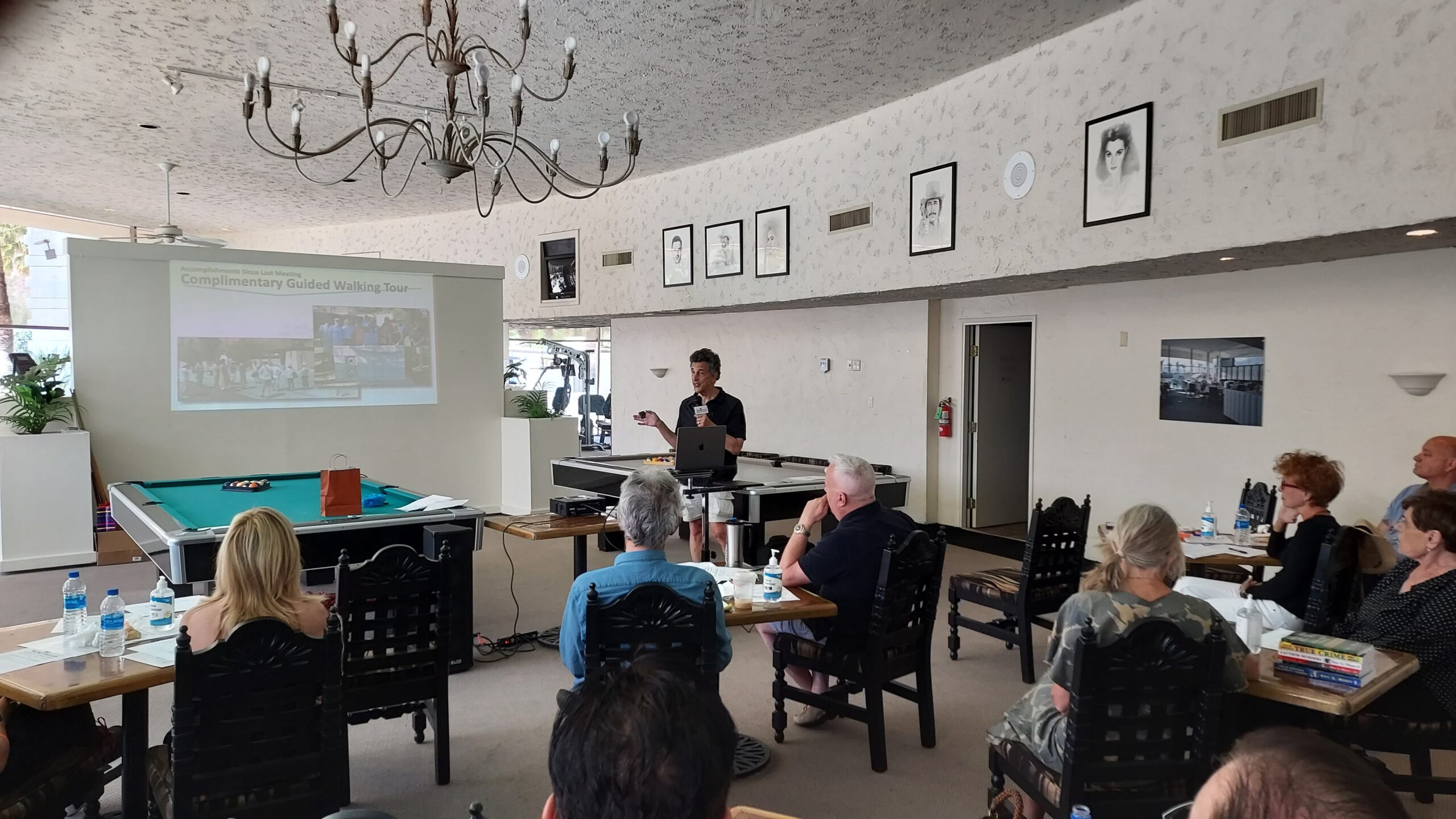 The meeting featured 2 guest speakers. Local author and historian Eric Meeks shared stories of “Twin Palms Celebrity Past” based on his experiences growing up and work in real estate in Palm Springs. Over the years he interacted with many famous people from Frank Sinatra to Betty Ford. He highlighted celebrities who have lived in Twin Palms over the years. He also shared information about many of the most architecturally noteworthy Palm Springs commercial buildings. Following his presentation there was a Q&A session.
