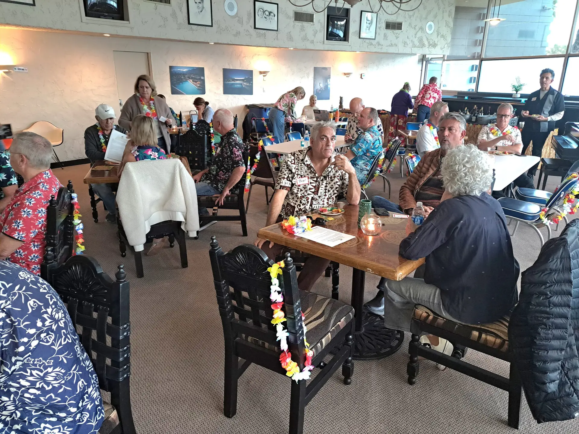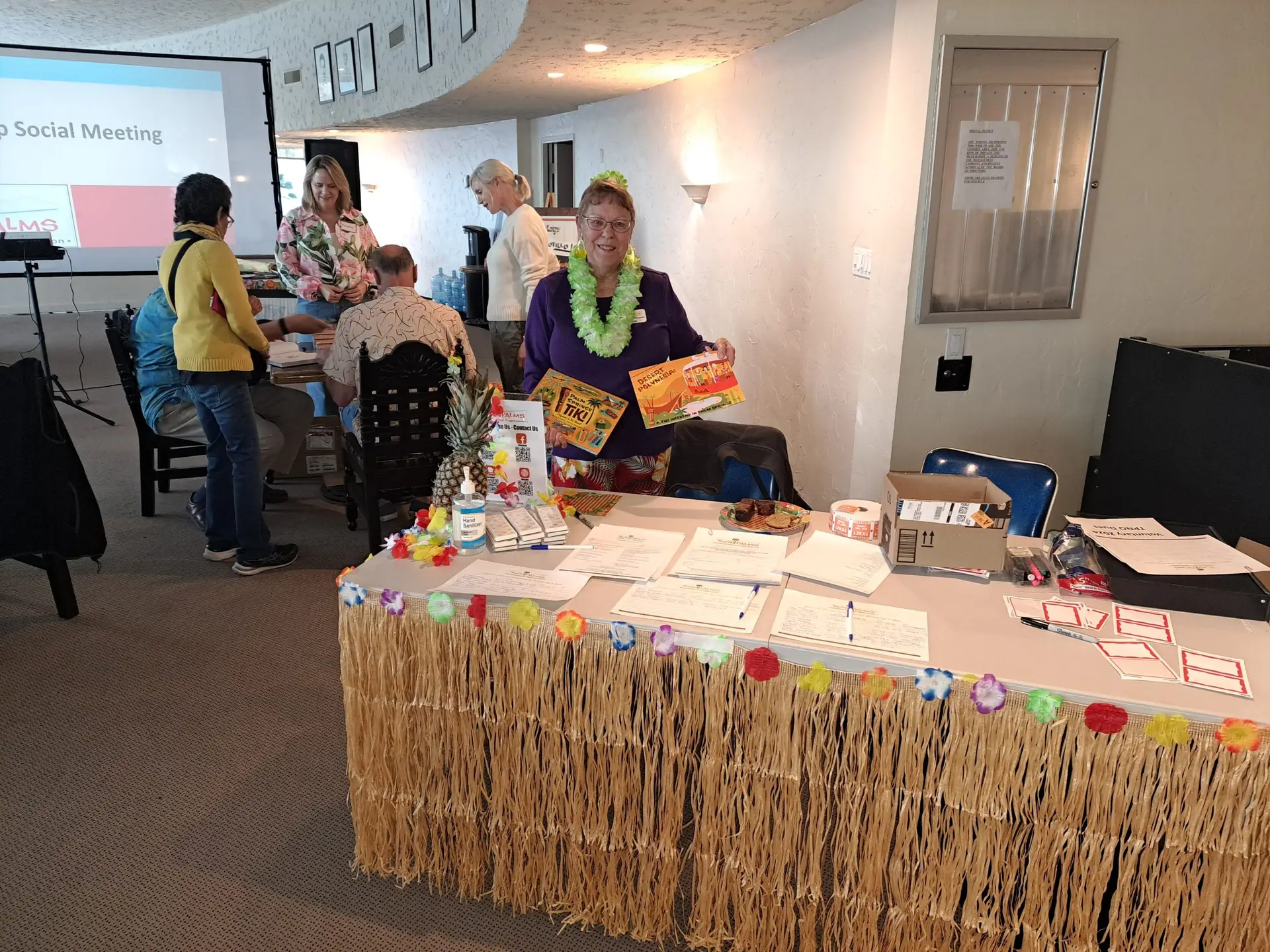 The Twin Palms Neighborhood Organization's annual general membership social meeting was held at 4:00 pm on Thursday, January 9, 2025 at the Ocotillo Lodge Clubhouse. Sven Kirsten and Peter Moruzzi, the authors of a newly published book "Palm Springs Tiki" were the featured speakers. To set the mood, the clubhouse was decorated with festive Polynesian decorations including grass skits on the tables and tikis and candles on the tables